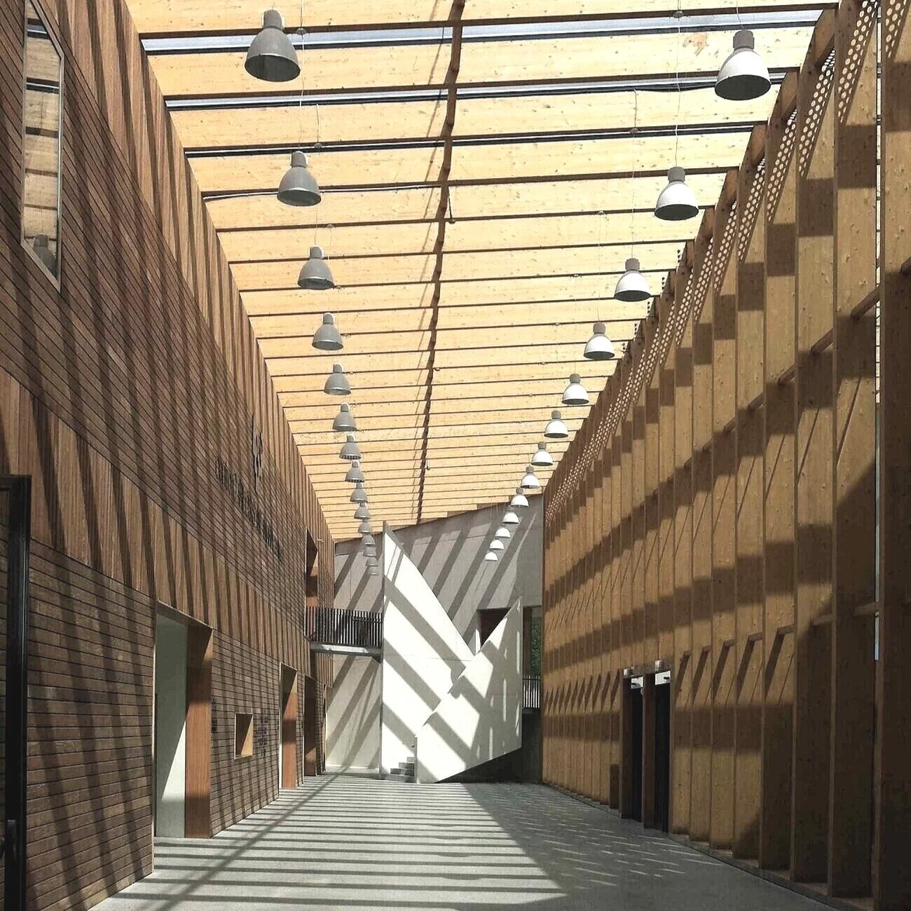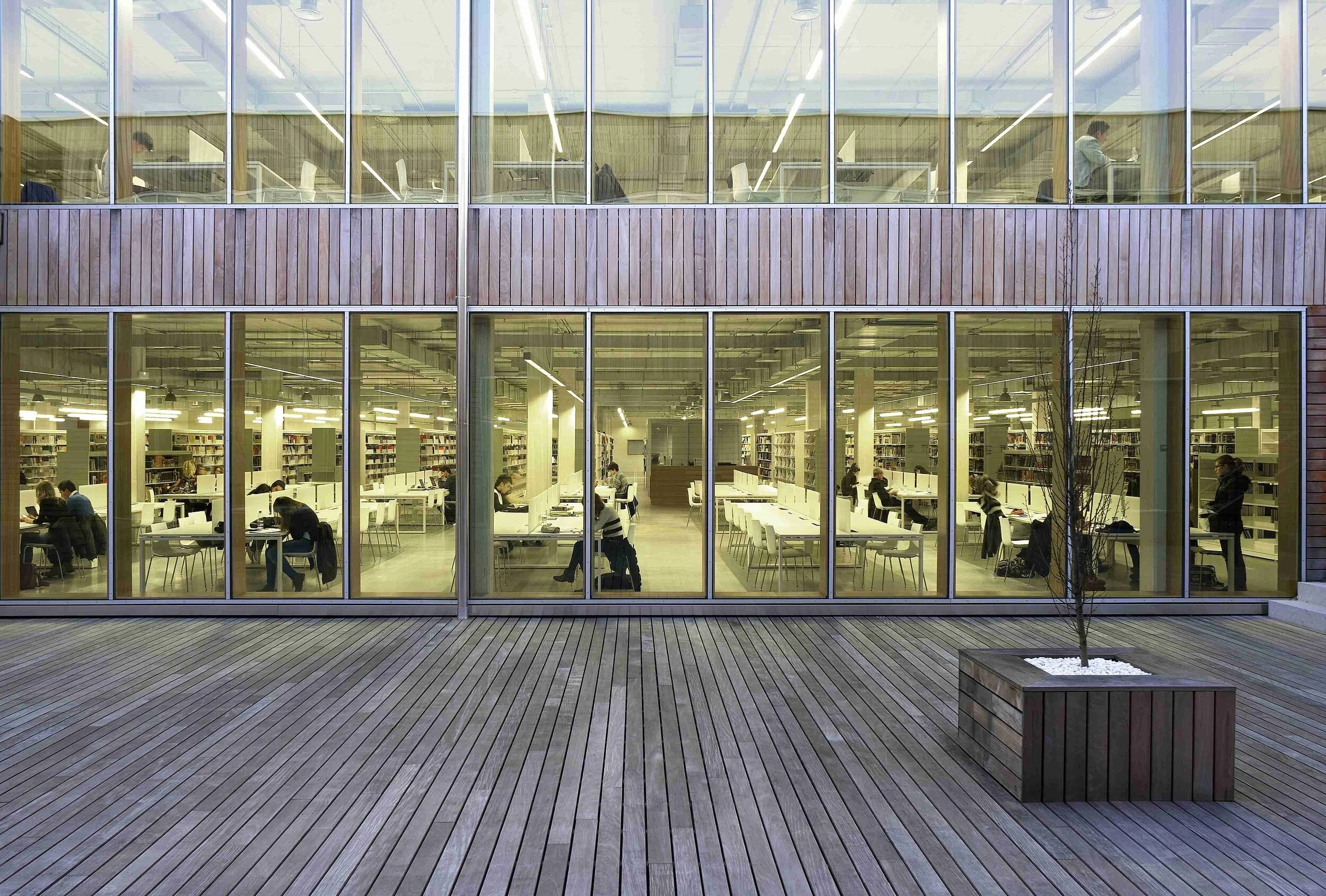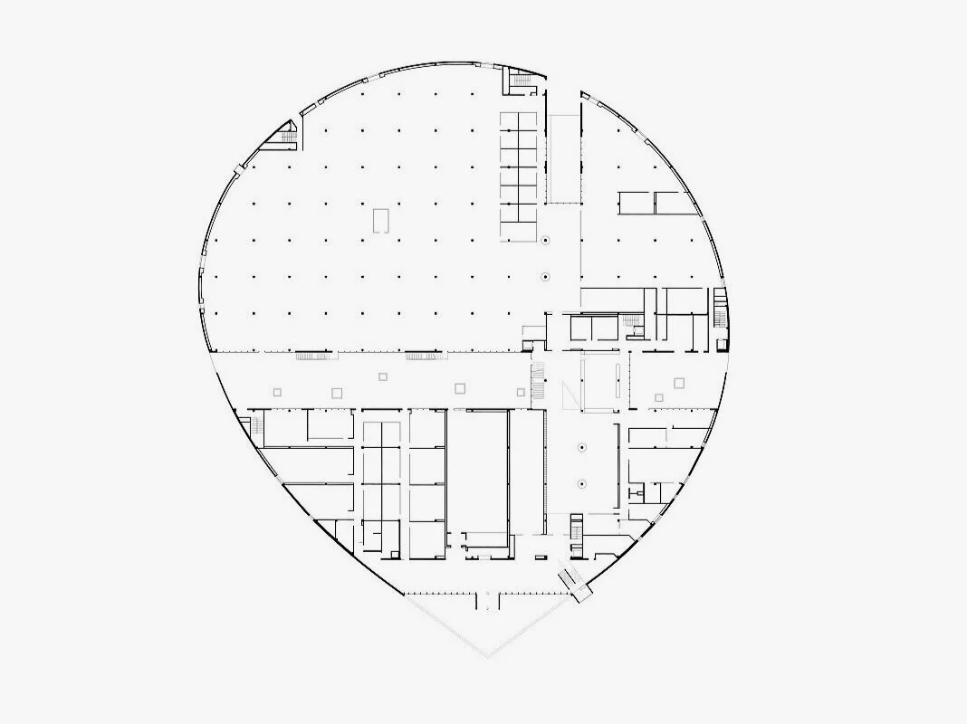El edificio se concibe como un gran contenedor, configurado a partir de un trazo espontáneo siguiendo la curvatura natural de la parcela. Interiormente dos bloques separados y ordenados según el norte y el sur crean un jardín privado interior. Es un espacio tranquilo, accesible para el paseo y la lectura. Iluminado siempre desde el sur y desde el norte.