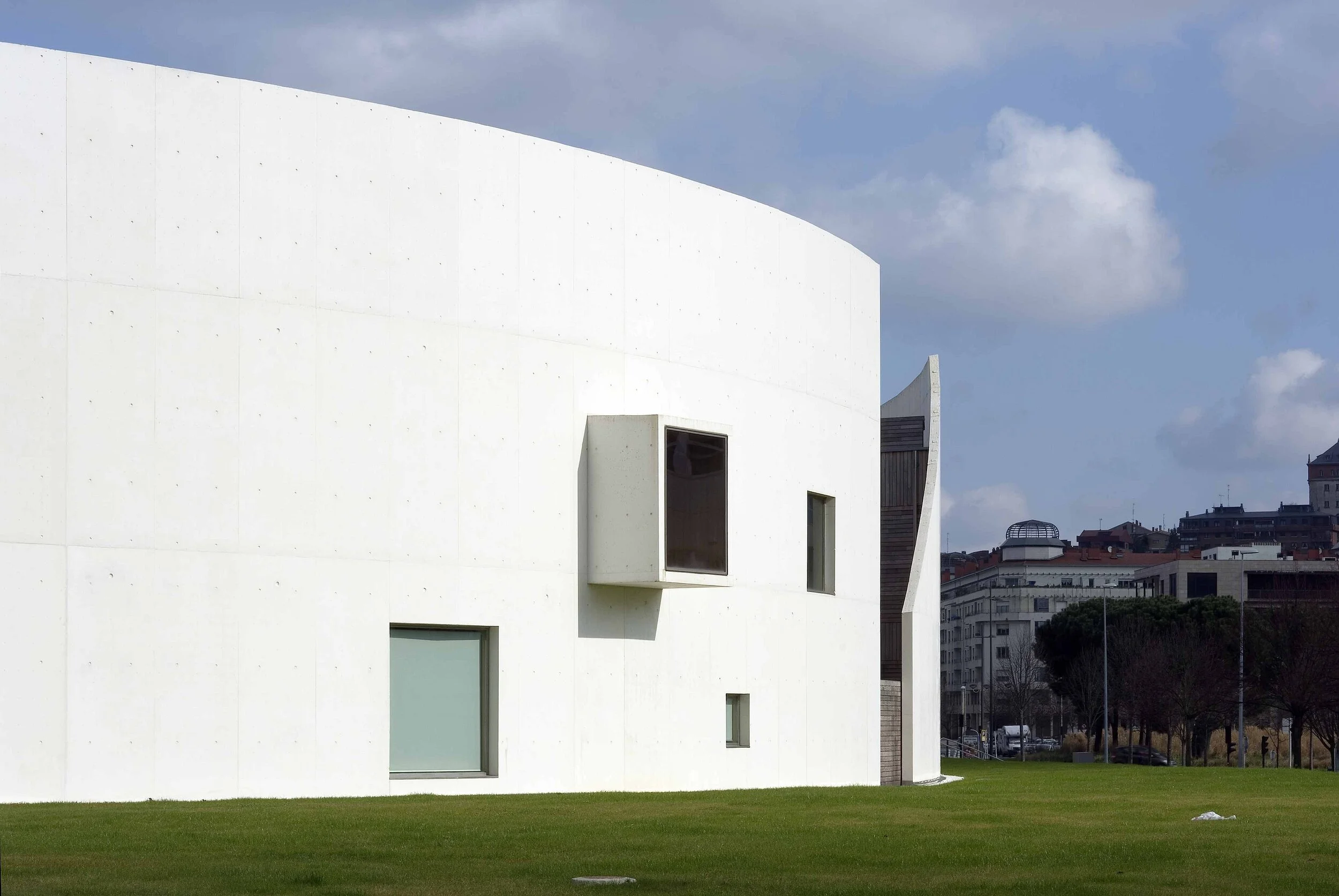 La fachada principal es una envolvente curva de hormigón autocompactable blanco concebida y construida como una piel independiente. Estructuralmente autoportante no participa de la estructura del resto del edificio del cual está separado en todo su desarrollo. El acceso al edificio se anuncia mediante un pico elevado que rompe la directriz curva del muro contenedor.